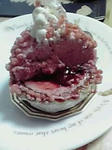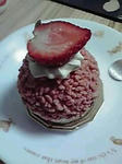 タルト生地にプリンを詰めてストロベリーソースをのせて、その上に丸いいちごババロアのせて、周りをピンクのフレークで飾る。
