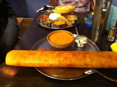 マサラドーサという、米と豆の粉から作る南インドのクレープのセットを注文。