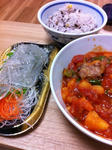 白魚刺身や鳥肉のトマト煮込み、チーズパテ2種とパン、肉じゃがete…まいうー!