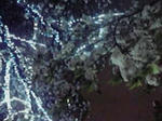 雨の中に咲き誇る八重桜と、青白いイルミネーション。
