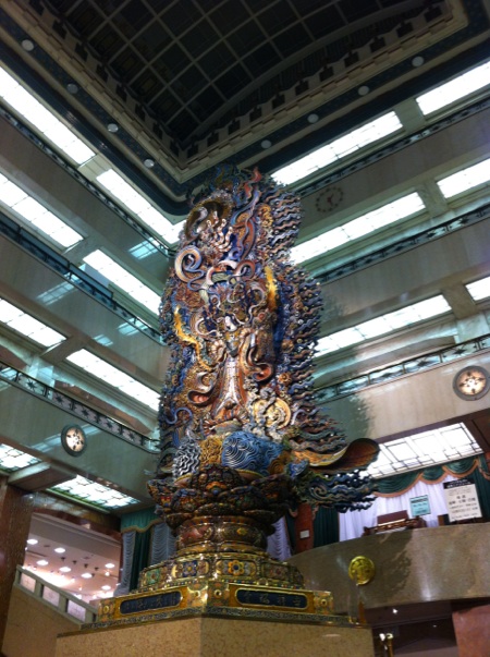 本館1階中央ホールから、吹き抜けの4階に届くようにそびえる壮大な天女の像。この像が完成したのは昭和35年(1960)のことです。この像は、三越のお客様に対する基本理念「まごころ」をシンボリックに表現する像として「まごころ像」ともいわれ、日本橋三越本店の象徴ともいえる存在です。